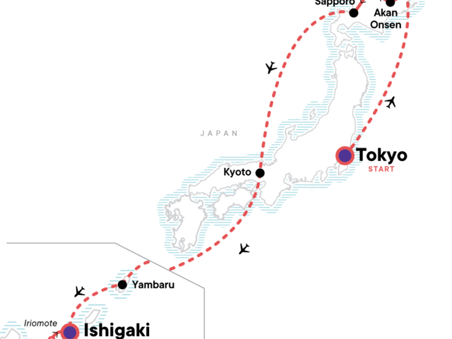 Your Foodie Moment: Ramen Dinner in Asahikawa, Asahikawa. Asakusa Sensō-ji Temple. Nakamise shopping street. Meiji Shrine visit. Free time in Tokyo. Shiretoko Five Lake trek. Furepe waterfall hike. Primeval Forest hiking. Sulphur mountain visit. Lake Kussharo hot spring beach. Lake Mashu Observation Deck. Akan Ryokan stay. Asahikawa Ramen dinner. Asahidake Ropeway. Sugatami Pong hike. Free time in Sapporo. Nijo Market visit. Sapporo Beer Museum visit and beer tasting. Kurama to Kibune trek & shrine visits. Fushimi Inari Taisha hike. Okinawa Rail Observation & Ibe-dake Forest Trail Trek. Yasuda Sea Kayaking excursion. Traditional Sabani Boat tour. Taketomi island cycling excursion. Mangrove kayak and hike on Iriomote Island. Internal flights. All transportation to/from included activities.