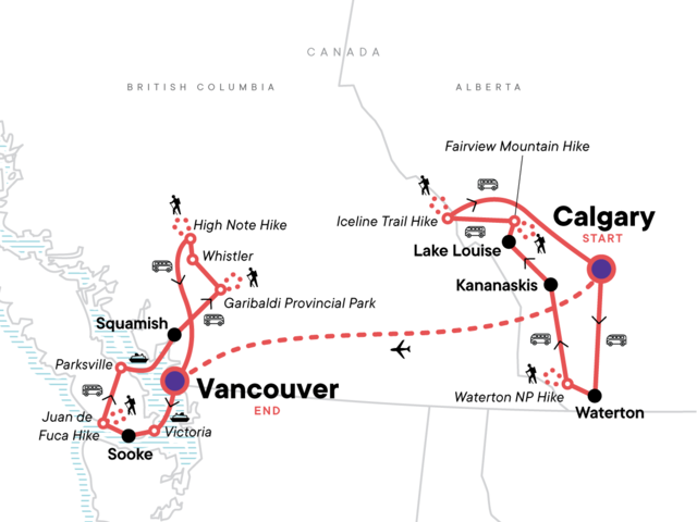 Your Welcome Moment: Meet Your CEO and Group. Trip to Waterton National Park. Hike along Bertha Lake trail. Visit to Red Rock Canyon. Hike the Crypt Lake or Carthew Summit trails. Hike the Ptarmigan Cirque trail. Burstall Pass trail. Banff National Park visit. Climb up Fairview Mountain. Embark on a scenic bike ride in Banff. Walk the Iceline trail in Yoho National Park. Flight from Calgary to Vancouver. Ferry ride from Vancouver to Sooke. Hiking in East Sooke Provincial Park. A trek along a portion of the Juan de Fuca trail. Cowichan Lake visit. Ferry from Nanaimo to Horseshoe Bay. A hike up The Stawamus Chief train. A visit to Garibaldi Provincial Park and a hike to the Elfin Lakes. A ride up the Whistler Gondola to hike the High Note trail. All transportation between destinations.