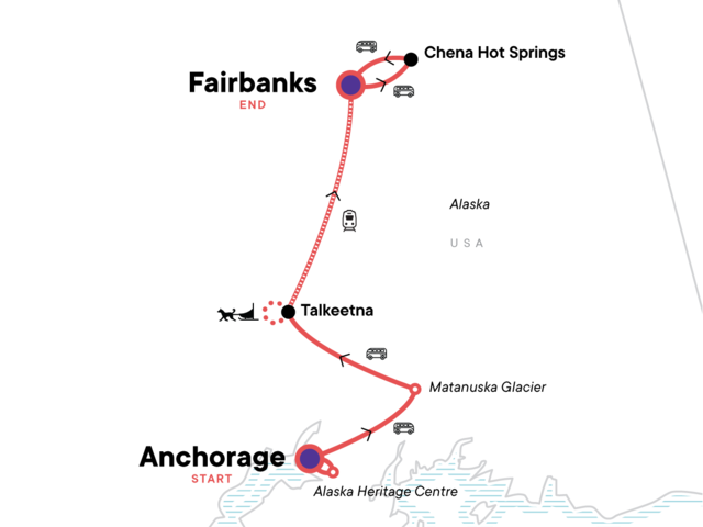 Your Welcome Moment: Meet Your CEO and Group. Eagle River Nature Center trail walking. Alaska Native Heritage Center visit. Matanuska Glacier guided tour. Iditarod Dog Sledding excursion. Ride on the Aurora Winter Train between Talkeetna and Fairbanks. Reindeer Farm visit. Northern Lights Viewing Tour. Chena Hot Springs. All transport between destinations and to/from included activities.