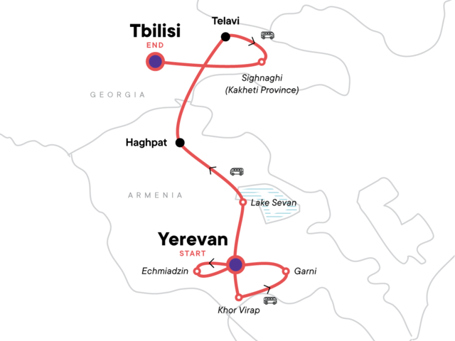 Your Foodie Moment: Lunch With A Local Family, Kakheti. Echmiadzin visit. Khor Virap visit. Garni Roman temple and gorge visit. Lake Sevan stop with visit to monasteries. Sanahin Monastery Complex visit. City tour of Tbilisi. Georgian Military Road drive. Mtskheta's UNESCO-listed churches visit. Jvari Monastery and Svetitskhoveli Cathedral visit. Hike to Uplistsikhe Cave. All transport between destinations and to/from included activities.