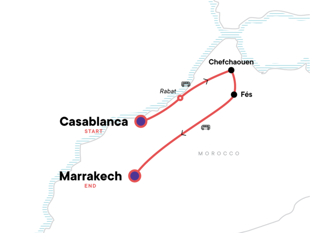 Your First Night Out Moment: Connect With New Friends. Enjoy free time in Rabat. Explore the blue city of Chefchaouen. Visit the medina and souks of Fès. Discover the bustling city of Marrakech. All transport between destinations and to/from included activities.
