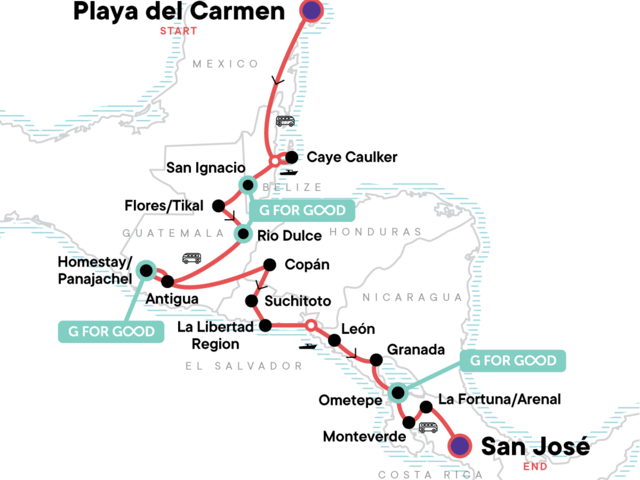 Your Discover Moment: La Fortuna. Guided tour of Tikal. Orientation walks in Antigua, León, and Granada. Beach time in Caye Caulker and El Tunco. All transport between destinations and to/from included activities.