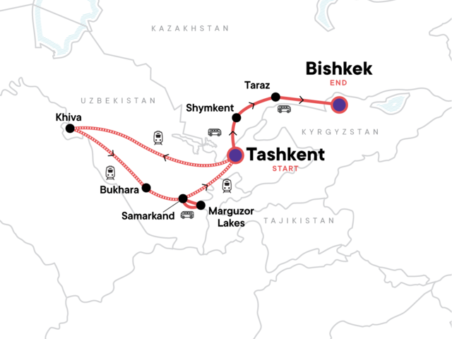 Your Big Night Out Moment: in Tashkent, Tashkent. Tashkent Orientation Walk. Free Time in Tashkent. Khiva Orientation Walk. Free Time in Khiva. Bukhara Orientation Walk. Free Time in Bukhara. Free Time in Samarkand. Panjakent Bazaar. Marguzor Lakes Visit. Marguzor Lakes 6 & 7 Hike. Free Time in Shymkent. Shymkent Orientation Walk. Sayram Su Lake Hike. Taraz Orientation Walk. Free Time in Taraz. All transport between destinations and to/from included activities.