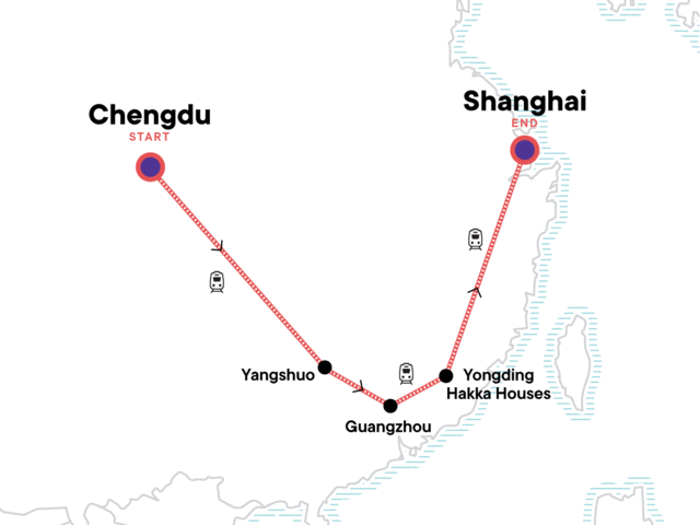 Your Big Night Out Moment: Shanghai. Orientation walks in Chengdu. Overnight stay in a traditional Hakka Village. Cycle tour through Yangshuo city and countryside. Orientation walk in Yangshuo. Chinese lunch in a local Yangshuo community. Guangzhou city tour. CEO-led walk through old town Shanghai. Free time in Shanghai.
