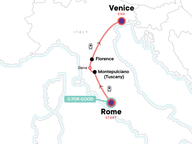 Your Foodie Moment: Florence Market and Food Tour, Florence. Christmas Market visits in Rome, Florence and Venice. Visit Pienza. Orientation walk of Montepulciano with wine tasting. Orientation Walk in Siena. Evening visit to Piazzale Michelangelo in Florence. Guided walking tour of Florence. Walking tour of Venice with a local guide. All transport between destinations and to/from included activities.