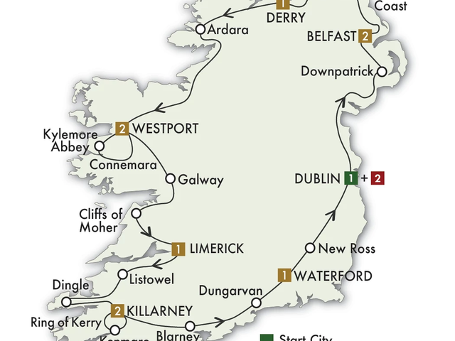 Travel along the River Shannon into County Kerry. In Listowel, sample tea and scones in the family pub of the famed playwright John B. Keane. Journey along the Dingle Peninsula to Slea Head for glorious views of hills and coastline. After free time in Dingle, travel on to Killarney. (B, D)