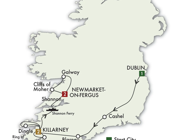 Discover the spectacular vistas of the Dingle Peninsula and its rugged coastline. See scenic Slea Head before going to the friendly town of Dingle for some free time. Depart Dingle, take a ferry across the Shannon Estuary, and arrive at your hotel in County Clare. This evening, dine at a medieval-style feast, where lords and ladies will serenade you with songs and music from days of yore. (B, D)