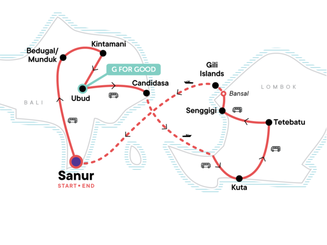 Your Discover Moment: Ubud. Beach time in Candidasa. Jatiluwih Rice Terraces visit (UNESCO-protected). Ulun Danu temple visit (Lake Bratan). Highlands of Kintamani visit. Mt Batur view. Local Indonesian meal experience. Kerta Gosa visit. Ubud orientation walk. Sasak village visit. Snorkelling trip. Tetebatu countryside trek. Sendang Gila Waterfall swim. Free time on the white-sand beaches of the Gili Islands. All transport between destinations and to/from included activities.