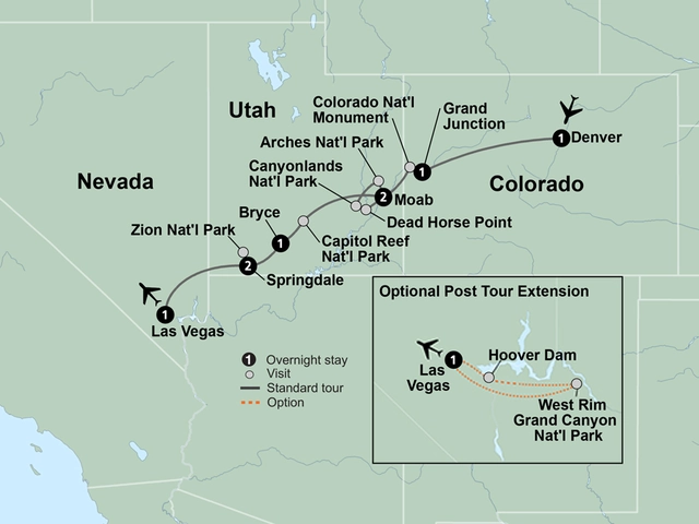 Trek across the Southwest as you take in the sienna-colored canyons, towering spires, and desert landscapes found in Utah’s five national parks. The backdrop of Denver’s Rocky Mountains is the starting point of your journey. In Colorado’s wine country, dine with new friends and enjoy a tasting at a family-run winery. Among vistas that evoke the spirit of the Old West, marvel at the unspoiled beauty of Utah’s five national parks. Make your way from Arches and Canyonlands to Capitol Reef, Zion, and Bryce National Park. Discover the bright lights and glitz of Vegas. Explore the kaleidoscope of colors found in America’s rocky western landscapes.