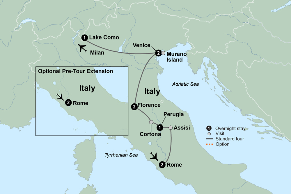 Embark on a captivating journey that takes you from the piazzas of Rome to the canals of Venice. Discover the rolling hills of the scenic Tuscan and Umbrian countryside. Explore medieval hill towns and visit Assisi, the birthplace of St. Francis. Spend time at a historic winery in the heart of the Chianti region and enjoy a chef-led cooking class with lunch. Discover the masterpieces of the Renaissance in Florence. See glass transformed into exquisite art on Murano Island. Linger in iconic Venice for 2 nights. Journey to the shores of glamorous Lake Como. Encounter a land rich in history, culture, art, and romance.