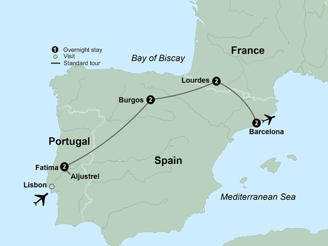 Travel to two of the world's most revered pilgrimage centers and experience the wonderful cultures and beauty of Portugal, France, and Spain. Stay two nights in Fatima and spend time reflecting and exploring the famous basilica and the tombs of Francisco and Jacinta. Travel to Aljustrel, where the children lived, and Valinhos, where Our Lady appeared after the children's return from prison. During a two-night stay in Burgos, visit its magnificent cathedral, a masterpiece of Spanish Gothic architecture and a UNESCO World Heritage Site. Enjoy a walking tour of Lourdes and a two-night stay there. Visit the Grotto where Our Lady appeared to Bernadette. End your tour in vibrant Barcelona.