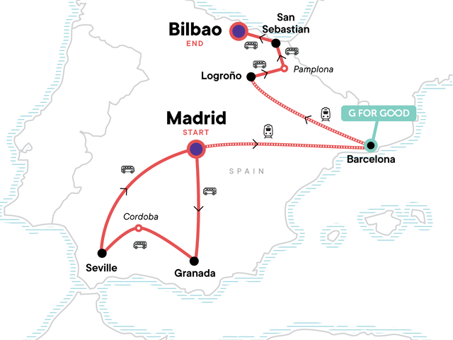In Spain, a land bursting with flavour, artistry, and passion, there's no such thing as going halfway. Start in Madrid, then travel south where the Andalucian capital of Seville will ignite your soul with the heart-pounding rhythms of flamenco. Then head north to explore the vibrant Basque and Catalan regions: soak up the energy of Barcelona, sip your way through Logroño’s wine country, indulge in San Sebastián’s legendary cuisine, and marvel at Bilbao’s striking architecture. With each region offering its own unique character, style, and language, this adventure through Spain's diverse landscapes and cultures is the full package.