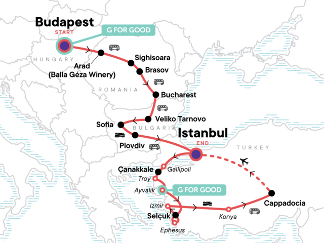 Your Local Living Moment: Dinner with Local Family, Çavuşin. Budapest orientation walk. Visit to the Balla Géza Winery. Guided tour of Sighisoara countryside villages. 'Dracula's Castle' (Bran). Bucharest orientation tour. Hike to Arbanasi village. Sofia orientation walk. Istanbul city tour with local guide. Gallipoli battlefields entrance and guided visit. Troy entrance and guided visit. Ephesus entrance and visit. Orientation walk in the old Kemeralti bazaar in Izmir. Tour the Mevlana Museum. Hike through the "fairy chimneys" of Cappadocia. Kaymakli underground city exploration. Internal flight. All transport between destinations and to/from included activities
