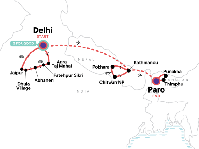 Your Local Living Moment: Barauli Community Guesthouse Stay, Royal Chitwan National Park. Sustainable Development Fees. Agra Fort visit. Taj Mahal visit. I'timad-ud-daulah (Baby Taj) entrance. Fatephur Sikri visit. Jaipur City Palace entrance and guided tours. Abhaneri stepwell visit. Guided tour of Bhaktapur City. Nepalese Dumplings Cooking Demonstration. Swayambhunath Temple Visit. Chitwan National Park 4x4 safari. Cycling through villages in Chitwan. Memorial Chorten & Motithang Takin Preserve visit. Tashichho Dzong visit. Chimi Lakhang Hike. Explore Paro Dzong and Archery grounds. Hike to Taktsang Monastery Tiger's Nest. All transport between destinations and to/from included activities. Flights from India to Nepal and Nepal to Bhutan.