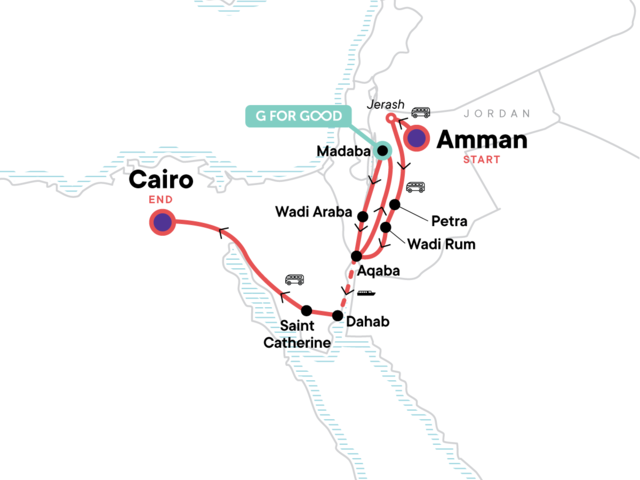 Your Big Night Out Moment: Cairo. Amman Citadel, Mosque and Amphitheatre Visit. Jerash Guided Visit. Little Petra and hike to Petra with guided visit. Sunrise visit to Petra. 4x4 Wadi Rum Desert Trip. Night Walk in Wadi Rum. Dead Sea Visit. Madaba Mosaics. Free time in Madaba, Aqaba, Amman, and Dahab. Wadi Araba Hike. Wadi Araba Camping. Saint Catherine's Monastery Visit. Mount Sinai Sunrise Hike. All transport between destinations and to/from included activities.
