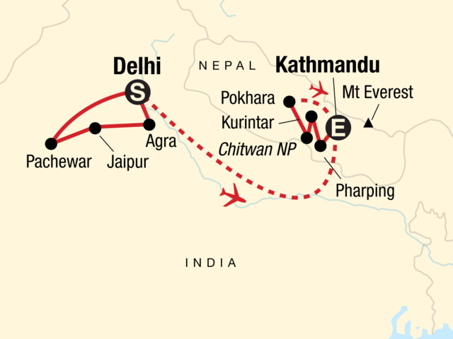 Your Welcome Moment: Welcome Moment - Meet Your Expedition Leader and Group. Visit the Taj Mahal, Baby Taj, and Agra Fort. Excursion to Fatehpur Sikri and the Abhaneri step wells. Explore Jaipur. Sound bath wellness experience and six-course vegetarian Nepalese dinner. Tour of Kathmandu. Bhaktapur guided tour. Visit Swayambhunath. Chitwan National Park village walking tour and jeep safari. Hike to the World Peace Pagoda. Internal flights. All transport between destinations and to/from included activities.