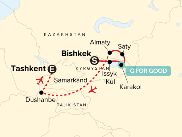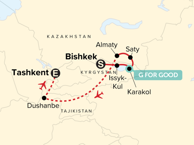 Your Welcome Moment: Welcome Moment - Meet Your Expedition Leader and Group. Arrival Transfer. Bishkek City Tour. National History Museum Guided Tour. Free time in Bishkek. Kyrgyz Family Meal. Burana Tower Visit. Iskra Village Dungan Family Lunch. Cholpon-Ata Petroglyphs. Kyrgyz Horse Farm. Karakol City Tour. Przhevalsky Museum. Yurt Building Workshop. Jety Oguz and the Broken Heart. Cossak Family Dinner. Charyn Canyon Visit. Almaty City Tour. Free time in Almaty. Dushanbe Orientation Walk. Guided City Tour of Dushanbe. Hisor Fortress. National Museum of Antiquities of Tajikistan. Tajik Almosi Village Visit and Bread Making. Tajik Almosi Village Visit and Bread Making. Internal flights. All transport between destinations and to/from included activities.