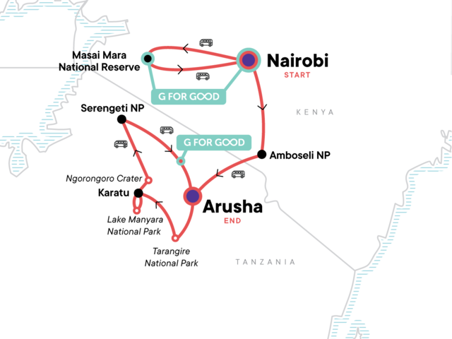 Spot Africa’s iconic wildlife in their natural, protected habitats on 4x4 safaris across Maasai Mara, Serengeti, Tarangire, and Amboseli, Take in breathtaking Kilimanjaro views and connect with Maasai culture in Amboseli National Park, Marvel at the stunning Ngorongoro Crater one of the world’s largest intact calderas, Enjoy a G Adventure-supported lunch where local women share their stories and create unique handicrafts, Explore Tarangire National Park, home to massive elephant herds and striking baobab trees, Discover local life on a coffee harvesting tour in Karatu, Journey through Karatu and Serengeti on a full-day safari adventure