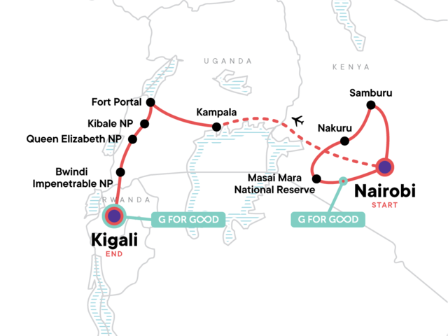 Your Welcome Moment: Meet Your CEO and Group. Samburu village visit and wildlife safari drives. Safari in Lake Nakuru National Park and Masai Mara National Reserve. Guest farm stay near Kibale National Park. Chimpanzee trek. Bigodi Community lunch. Queen Elizabeth National Park wildlife safari drives. Guided gorilla trekking in Bwindi Impenetrable National Park. Visit to Kigali Genocide Museum. All national park fees and trekking permits. Internal flight. All transport between destinations and to/from included activities.