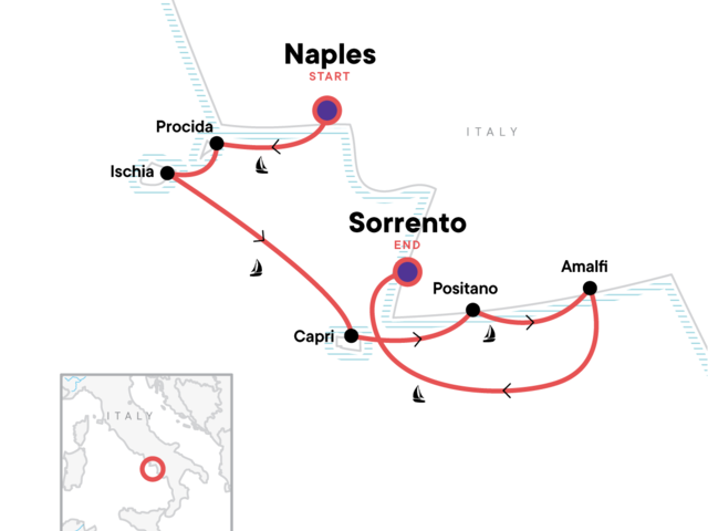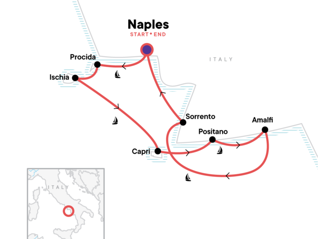 Sunset in Ischia. Blue Cave Visit. Swimming stop near Capri. Swim stops along the sailing route. Cooking class in Sorrento. Free time to explore in Procida, Ischia, Capri, Positano, Amalfi, & Sorrento. All transport between destinations and to/from included activities.