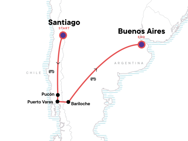 Pack your bags and get ready to bounce through South America on this 12-day ride full of wild nature, epic nights, and laid-back lake vibes. Start in Santiago and hop an overnight bus to Pucón, where volcanoes, hot springs, and endless adventure await. Cruise through Chile’s dreamy Lake District with a chill stop in Puerto Varas, then cross into Argentina to explore the outdoorsy paradise of Bariloche. Hike, bike, or just soak it all in — your pace, your way. Wrap things up in buzzing Buenos Aires with tango, steak, and one last big night out. This is South America in full colour, and you’re living it large.