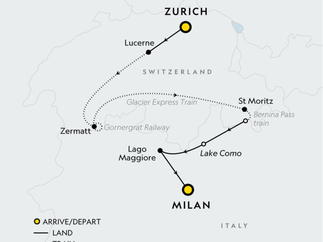 Your Foodie Moment: Rocca di Angera Cooking Class, Angera. Arrival and Departure Transfer. Lucerne Walking Tour. Gornergrat Visit. Expert-led alpine walk from Riffelalp. Expedition Leader Walk of Zermatt. Cable Car to Furi. Gondola to Glacier Paradise. Glacier Express to St Moritz. Muottas Muragl Funicular. Confectionary shop Lecture and Chocolate Making Demonstration. Bernina Pass Train Ride. Cruise to Villa del Balbianello with Tour. Expedition Leader Led Walk of Bellagio. Rocca di Angera Cooking Class. Walking Tour of Isola Madra. Walking Tour of Borremeo Villa. Engaging Discussions with the National Geographic Expert Throughout. Porterage at hotels and when getting on and off of vehicles. Tips are included for all activities, meals and porterage, except for your Expedition Leader. All transport between destinations and to/from included activities.