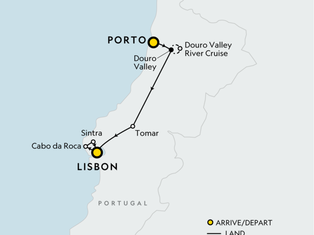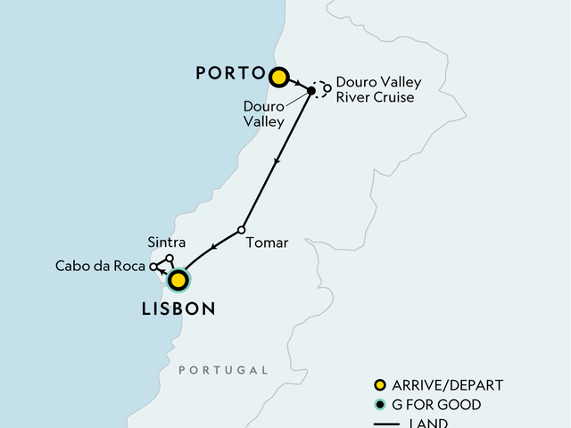 Explore the rich cultural tapestry of Portugal's mainland on a journey through its history, gastronomy, and spectacular scenery. Be immersed in Porto’s ancient trading culture and the terraced vineyards of the Douro Valley, visit the seat of the Knights Templar and engage with a social enterprise for a meal in Lisbon. From the sounds of a traditional Fado music show to the last drop of a glass of local wine, experience Portugal’s past and present like never before.