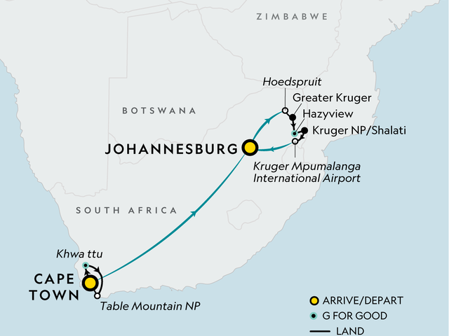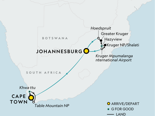 Signature Moment: Private Tour & Talk at the Nelson Mandela Foundation, Johannesburg. Arrival transfer. Private wine tasting at Groote Post Wine Estate. Table Mountain Aerial Cableway ride to the summit. Walking tour of the Bo-Kaap Neighbourhood. Guided visit to District Six Museum. African Dining Experience at Gold restaurant. Guided visit of Cape of Good Hope with a ride on the Flying Dutchman Funicular. Visit to the Boulders Penguin Colony Visitor Center. Internal flight from Cape Town to Johannesburg. Private guided tour of the Apartheid Museum. Internal flight from Johannesburg to Hoedspruit. . Afternoon safari drive with an EWT conservationist in the Greater Kruger Area. Morning and afternoon safari drives in the Thornybush Private Game Reserve. Kruger National Park Safari Drives. Internal flight between Kruger and Johannesburg. Departure transfer. Engaging Discussions with the National Geographic Expedition Expert throughout. Porterage at hotels and when getting on and off of vehicles. Tips are included for all activities, meals and porterage, except for your Expedition Leader. All transport between destinations and to/from included activities.