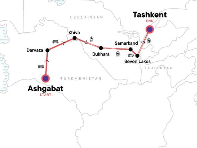 Wander Ashgabat's surreal marble streets and uncover Old Nisa's ancient past, Spend a night in a desert yurt beside the blazing Darvaza Crater, Ride trains through open steppe and watch the Silk Road unfold outside, Cross into Tajikistan for the Seven Lakes and a home-cooked village meal, Tick off the big three — Khiva, Bukhara, and Samarkand — in one epic sweep