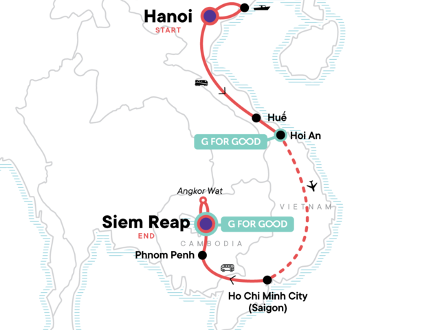 Your Discover Moment: Ho Chi Minh City. Free time to explore Hanoi. Halong Bay caves entrance. Halong Bay boat cruise with seafood lunch and dinner. Free time in Hoi An. Imperial Citadel and Tomb entrance (Huế). Free time in Ho Chi Minh City. Cu Chi Tunnels entrance and tour. Free time to see Phnom Penh on your terms. Cyclo tour (Phnom Penh). Tuol Sleng and Choeung Ek (Killing Fields) entrance and guide. Two-day Angkor Wat complex entry and guide, including sunrise tour (Siem Reap). Free time in Siem Reap. Internal flight. All transport between destinations and to/from included activities.