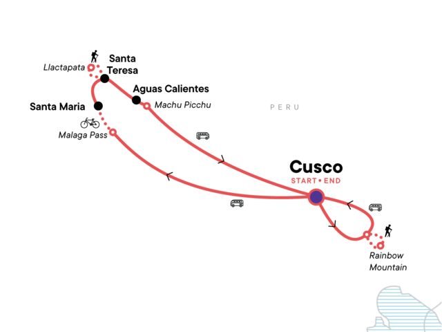 Your Big Night Out Moment: Cusco. Mountain Biking (Malaga High Pass). Llactapata hike. Ziplining. Train to Aguas Calientes. Guided tour of Machu Picchu. Rainbow Mountain hike. All transport between destinations and to/from included activities.