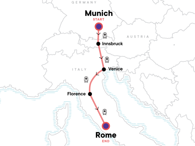 Check out the Imperial Palace of Innsbruck before piling back onto the train to head into epic scenery of the Dolomites. Think filling your feed with crystal clear mountain lakes and snow-capped peaks. Don't forget that Venice is the end goal of today so pump yourself up for the famous canal city on the horizon. Tonight join your CEO for a nice cold beverage and see where the night takes you.